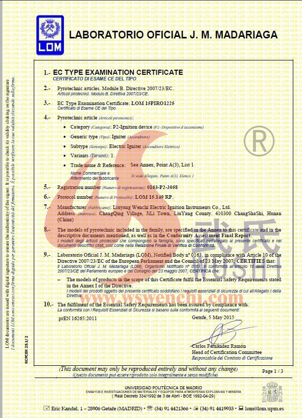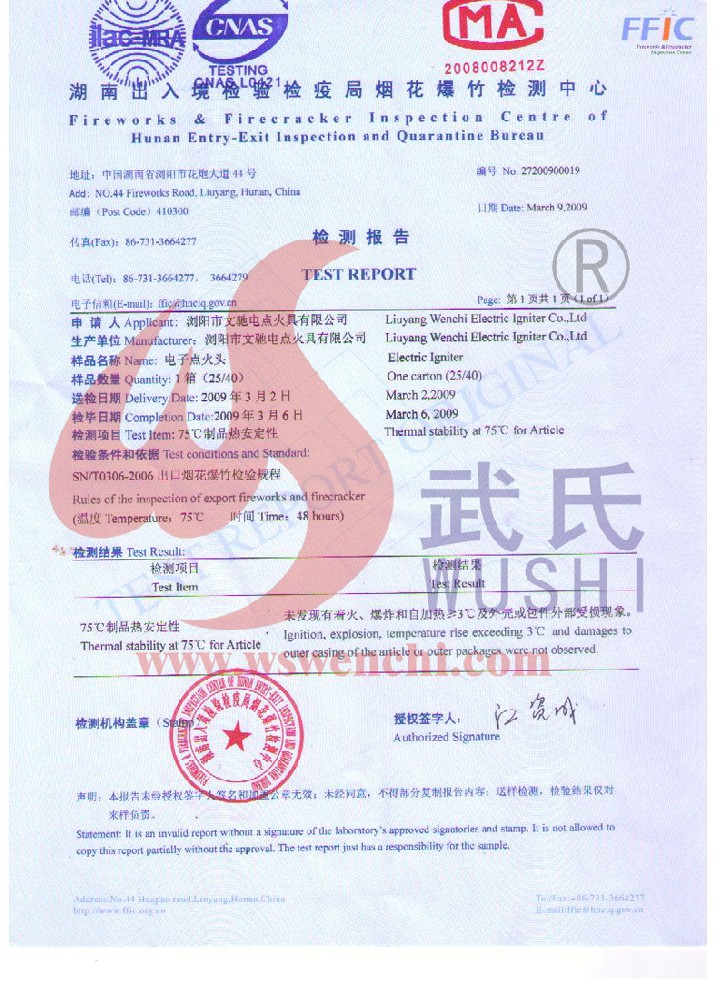 瀏陽市文馳電點火具有限公司(原培文電子點火器材廠),創(chuàng)建于1998年,是一家專業(yè)從事研制銷售電子點火產(chǎn)品的民營科技企業(yè),是我國第1枚煙花用電點火頭生產(chǎn)者,是《煙花爆竹電點火頭國標》牽頭起草單位。公司位于中國“煙花之鄉(xiāng)”湖南省瀏陽市,地理位置優(yōu)越,交通便利。 我公司研制的對象是用電能引燃火藥、做機械功等預定功能的一次性使用的元件或裝置,包括電點火頭(英文名ElectricMatch or Electric Igniter,中文俗稱“電火柴”或“電發(fā)火頭”)、電點火管和延期電點火管;我們估且在以后的產(chǎn)品技術欄中將我們研究的產(chǎn)品統(tǒng)稱為電點火具,將電點火器看成是用于提供和控制供給電點火元件點火的電能器材;我們研究的電點火橋路有橋絲式、無橋絲···